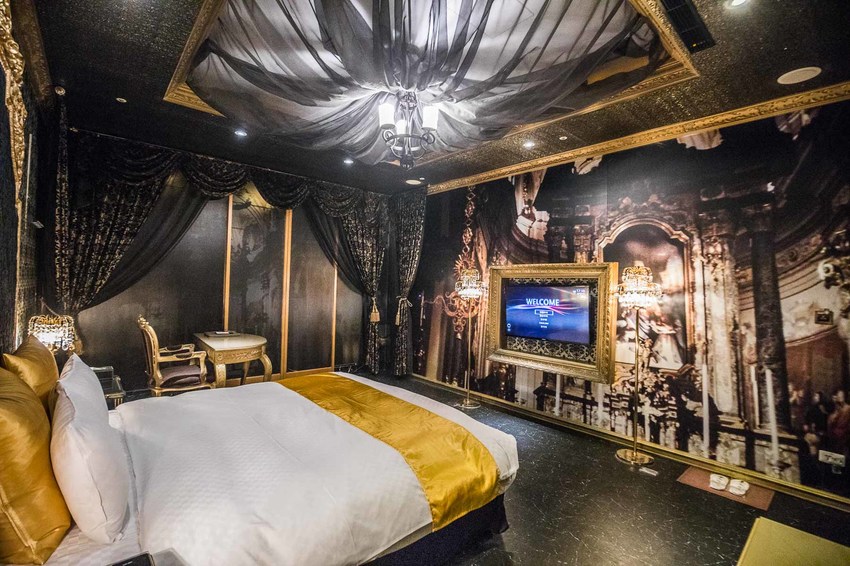 今天我們休息的房型是211 歌劇魅影(皇后房型),歌劇魅影是以紅磨坊華麗劇場為設計風格,運用各項經典古典元素,打造出華麗優雅的法式古典,房間內融入許多金色與黑色色調,營造出華麗奢華的感覺,加上吊燈與黑色紗幔,浪漫指數破表!