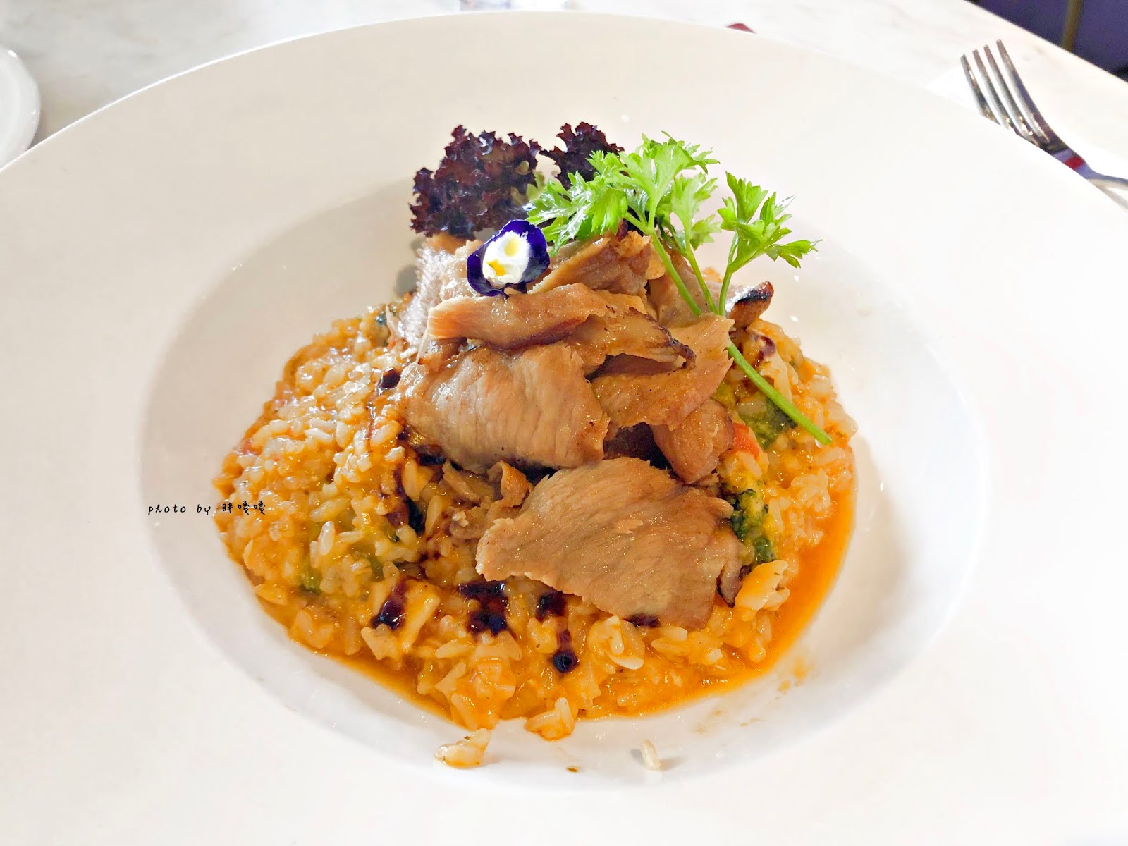 將紅甜椒烤過後製成的醬料加在燉飯裡