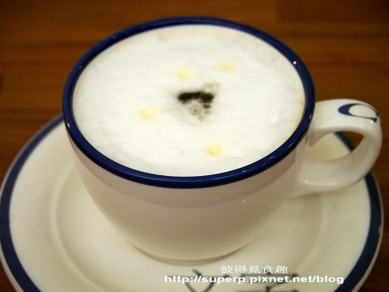 Cappuccino咖啡(咖啡上撒了些許的檸檬末跟巧克力粉,還搭配了肉桂棒,也頗用心的)