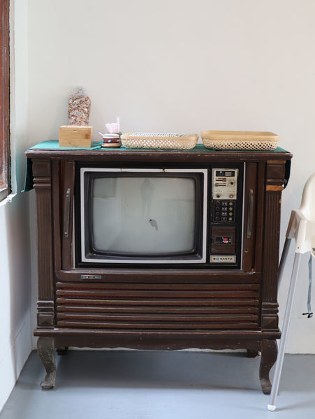 餐具就放在這老電視上。