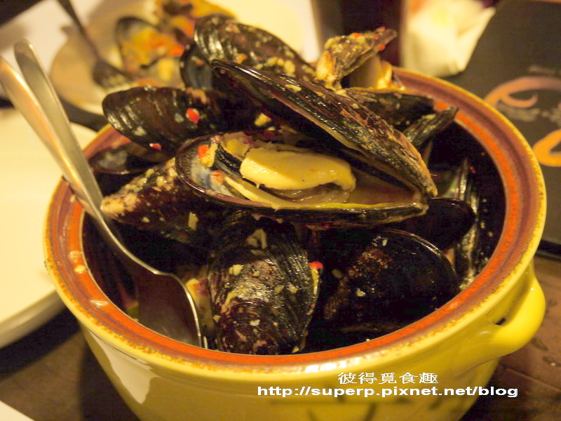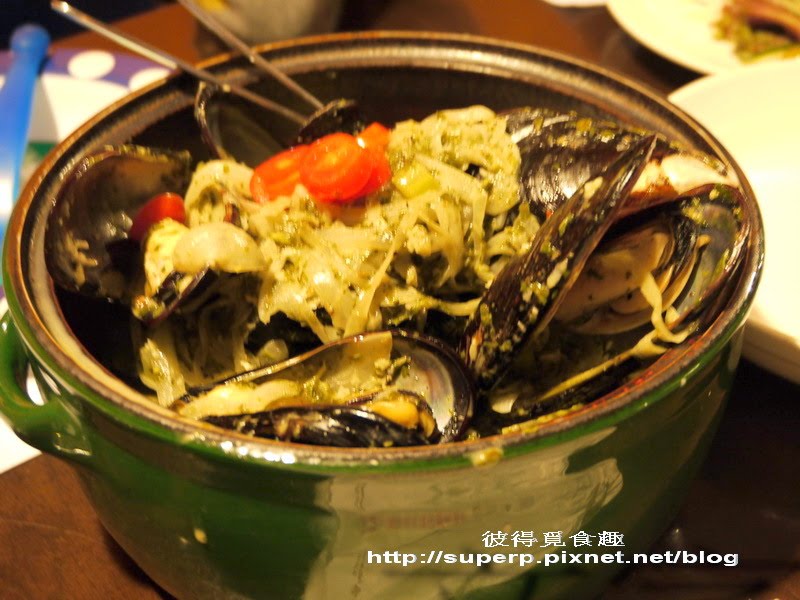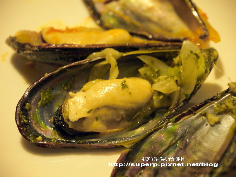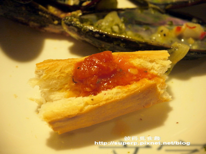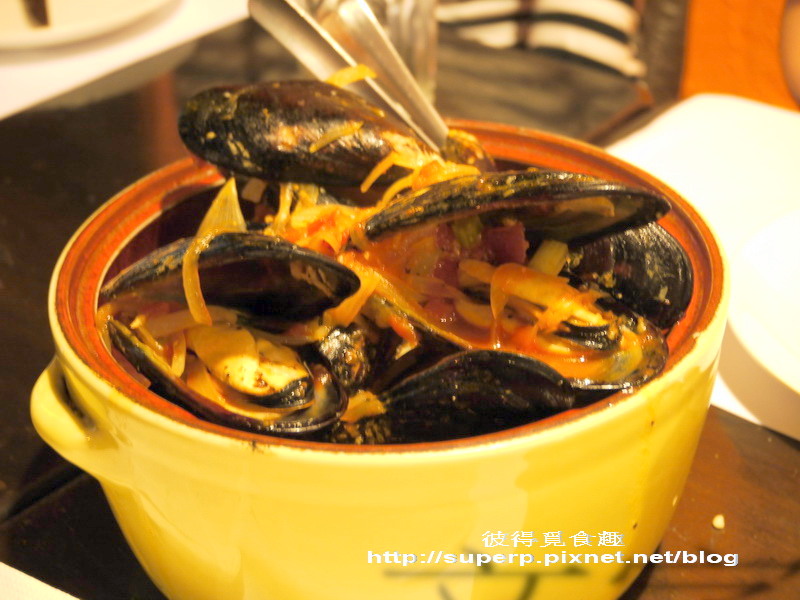 番茄淡菜$430(淡菜肥嫩鮮美,跟一般吃到的乾扁無味的完全不一樣。淡菜就是孔雀蛤,據說這是從馬祖那邊進口的,所以不是紐西蘭的冷凍貨。這就用番茄跟洋蔥一起去炒,非常好吃,醬汁沾麵包吃也是一絕,大推!)
