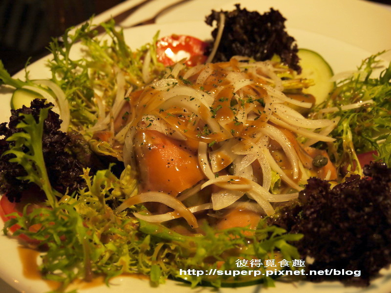 燻鮭魚沙拉$320(沙拉醬汁帶些微酸,燻鮭魚品質普普,是道令人沒什麼印象的沙拉)