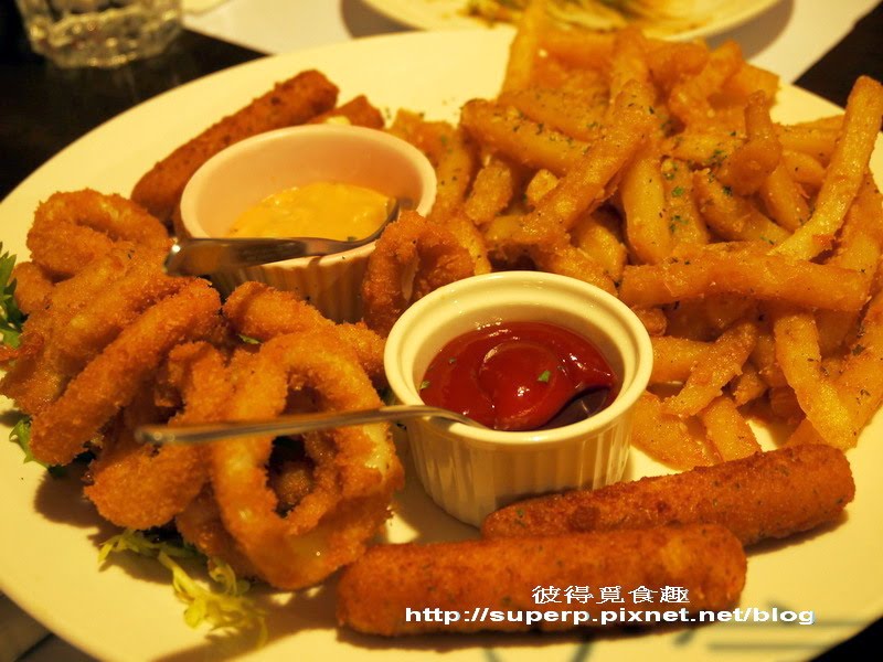 綜合炸物拼盤(這是點給小孩子吃的,因為他們想吃薯條。裡面還有洋蔥圈和炸乳酪,也是一般)
