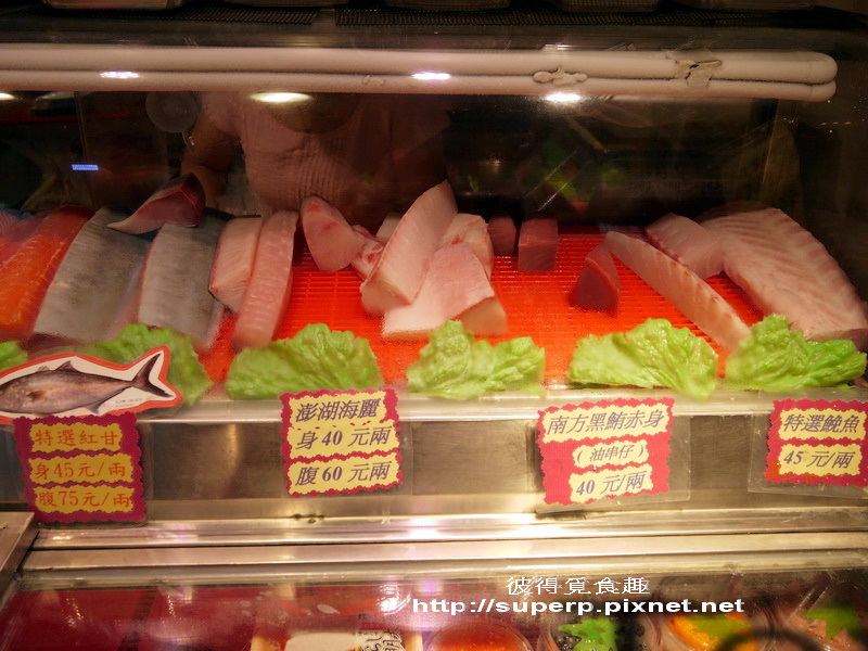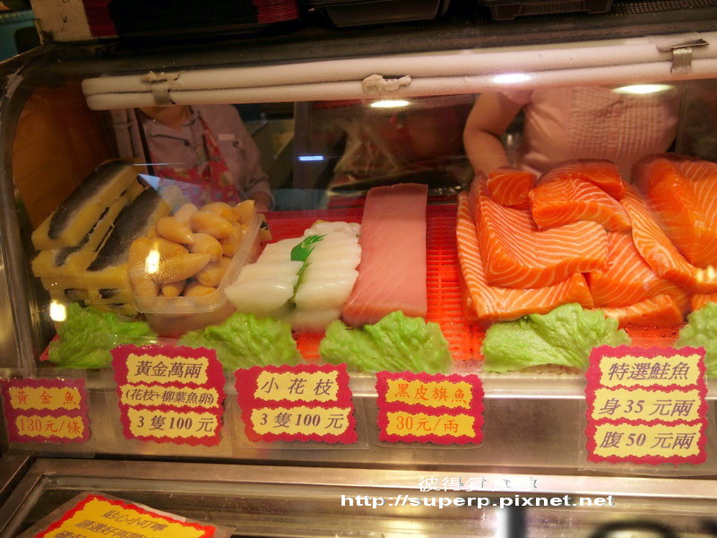 這邊的主力產品是生魚片,而也有提供干貝,花枝,甜蝦,海膽那類的生食。小菜我倒是沒買過,因為預算都花在生魚片了。價格都是以兩計算,或可以跟店家說要特定金額的某部位即可。