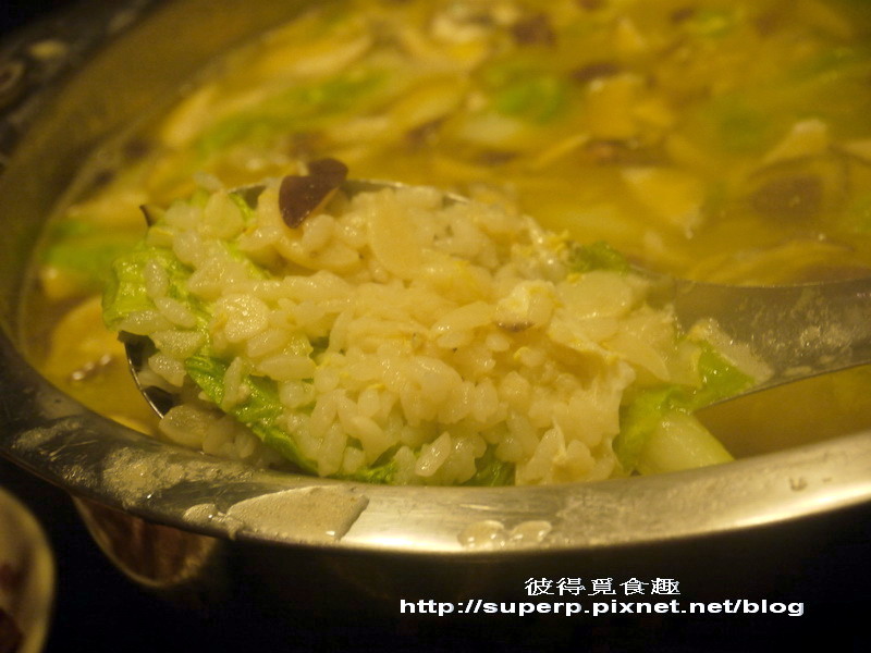 奶油螃蟹粥(這是點奶油螃蟹就會附贈的,把蒸完螃蟹和奶油的高湯拿去煮粥,而且加如蔬菜跟香菇以及一些蚵仔,份量極多,非常鮮美!好吃,大推!)