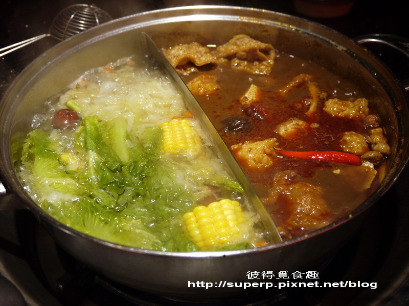 我們6個人分兩份鴛鴦鍋。我們這份是煮麻辣鍋和酸菜白肉鍋。麻辣鍋的香氣十足,不過喝起來鮮味不是那麼明顯。我吃過的單點麻辣鍋店不多,最喜歡的是鼎王。沒辦法,雖然知道不該拿單點麻辣鍋的水準來比,但就是會不自覺的這樣做XD