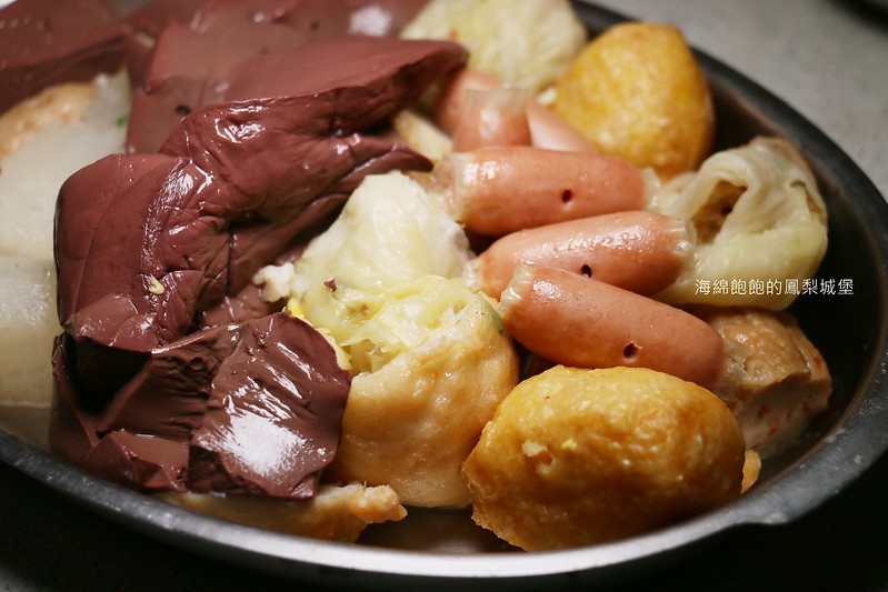 有鴨血、高麗菜捲、黑輪、福袋、鑫鑫腸、干貝花枝