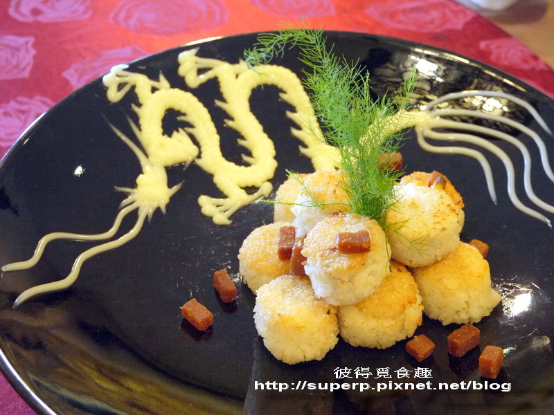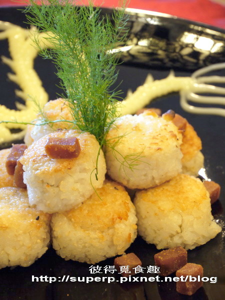 銀龍鍋巴飯(美奶茲擠成龍的圖樣,搭配鍋巴飯糰,旁邊用一些烏魚子塊點綴,賣相極佳。鍋巴飯外酥內軟,裡面還有烏魚子,味道很可口,而且增加一些飽足感,推!)