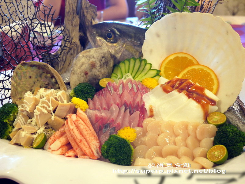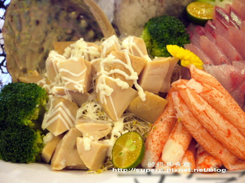 豪華海鮮拼盤(一端出來就震懾全場,擺盤非常大器。裡面擺滿了干貝,蟹肉棒,鮑魚塊,生魚片…等等的食材。食材的鮮度均佳,推!)