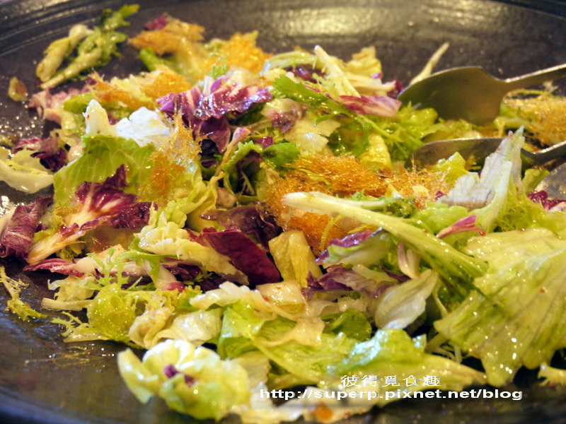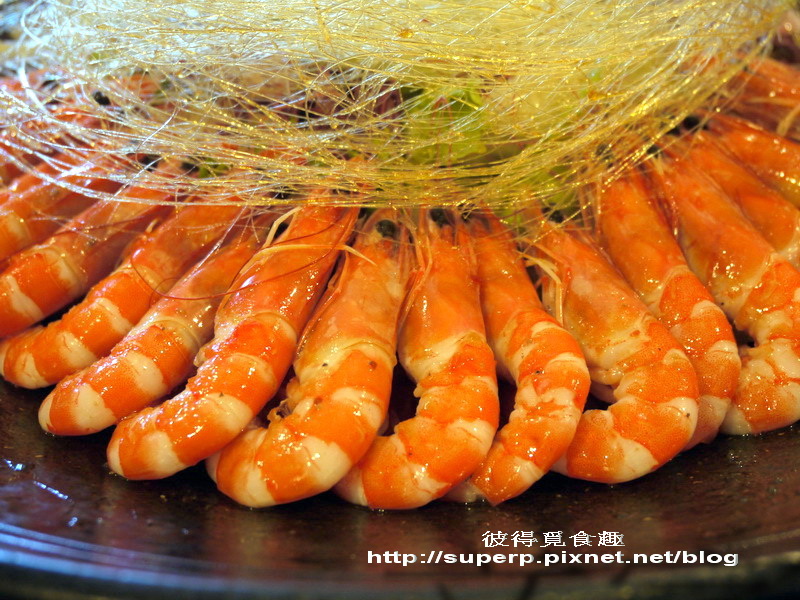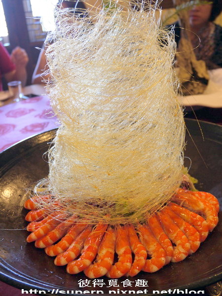 鮮蝦拉糖沙拉(也是氣派十足的一品。蝦子已經去殼,把沙拉圍成一圈,上面擺了一堆拉糖。吃之前要把拉糖給弄碎,跟沙拉和蝦子一起吃。很特別的組合,沙拉會帶些微甜,還不錯,推!)