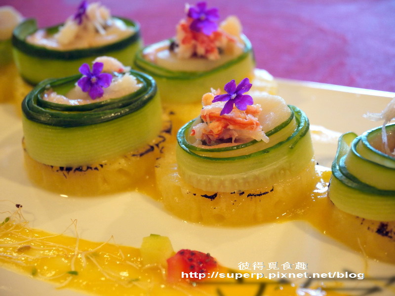 鮭魚干貝捲(小黃瓜裡面捲了鮭魚和干貝,下面鋪了鳳梨。味道頗為豐富,海鮮的鮮加上鳳梨的甜,頗有創意,味道也算不賴)