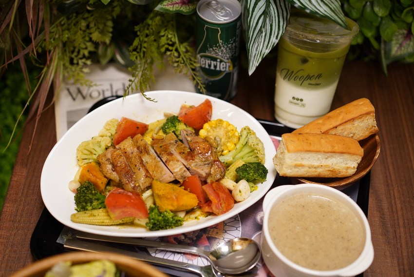 再來這款蘿勒烤雞腿溫時蔬也是值得一試,配料一樣有番茄、馬鈴薯、花椰菜、甜脆玉米、菇類等等,蘿勒烤雞腿肉質軟嫩入味,這份吃完挺有飽足感的。