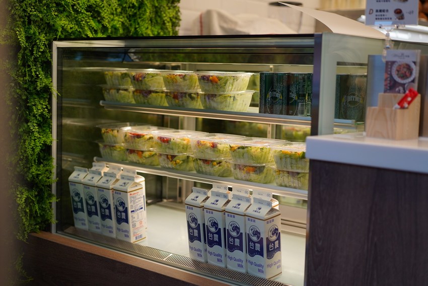 櫃台旁可以清楚看店新鮮的沙拉及台農鮮乳。