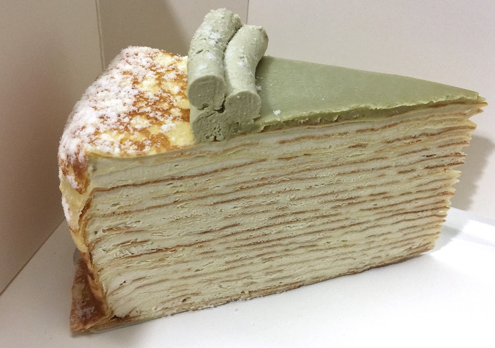 那麼就來說說千層吧,上層淺綠是無糖烏龍茶香緹奶油,型態最輕盈,茶香最多,是我全部最喜歡的部份,墨綠則是全糖烏龍茶卡士達醬,雖然很甜但還是有一點茶香所以也ok。