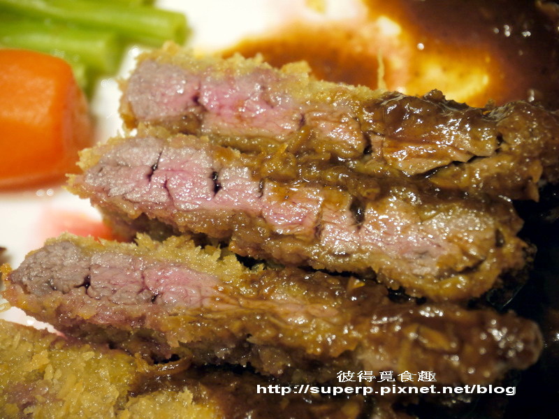 炸菲力牛排佐特製醬$300(很少吃到炸牛排,所以點來吃看看。牛排炸的程度剛剛好,處於粉紅色的熟度。搭配類似紅酒牛肉demi-glace醬汁,非常讚!大推!)