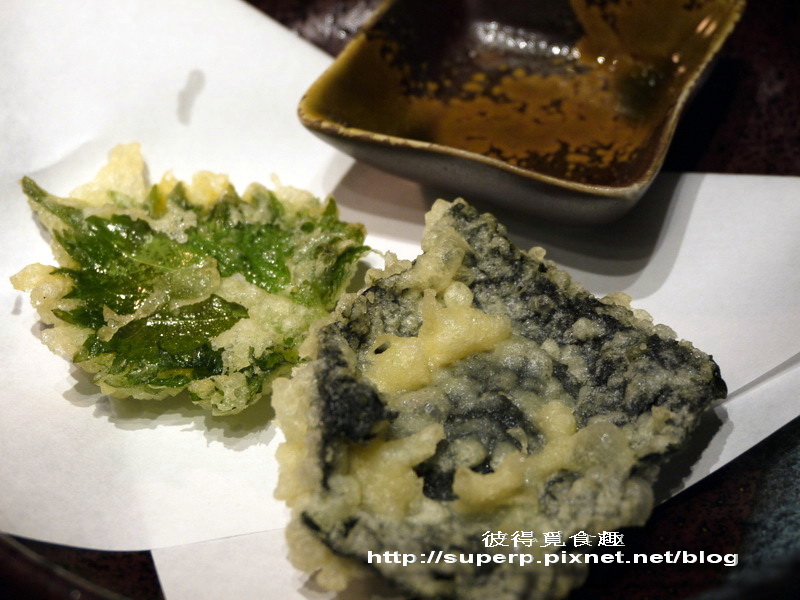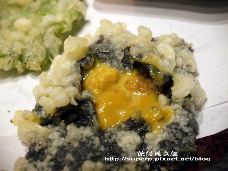 海膽天婦羅$270(這很炫,從沒在其他店看過這個。有紫蘇葉包海膽,以及海苔包海膽下去一起炸。覺得海苔的組合比較好吃,不過這個分量當然不可能多,所以感覺就是嚐鮮用的。沒吃過的可以點看看。)
