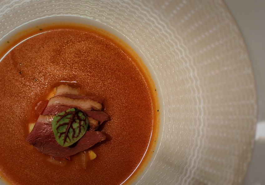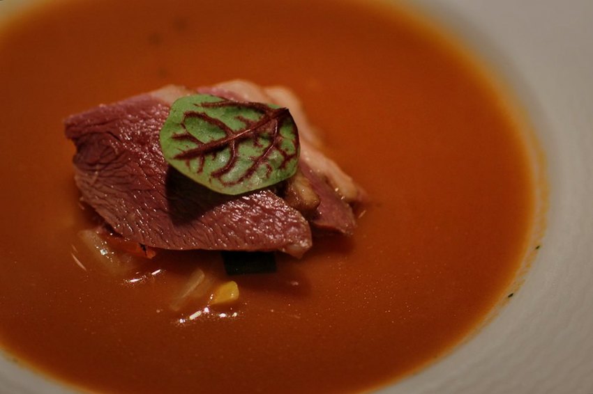 燻鴨番茄濃湯,底層是馬鈴薯泥再搭配著煙燻鴨肉,接著會由專人淋上用番茄濃湯,口感十分的濃郁且層次感很豐富。
