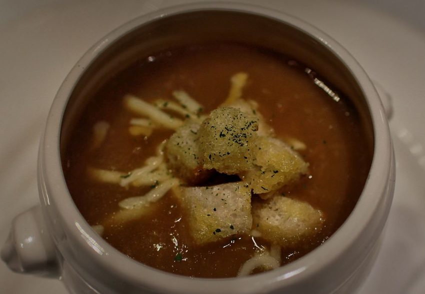法式起司洋蔥湯,洋蔥的焦香甜味完全融入在湯頭內,再搭配著雙色起士一同入口,多層次的口感難以形容,這可是重度起士者必點的湯品。