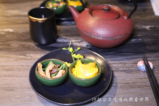 入座後服務人員端來四種茶品,有台灣茶、日本茶兩種提供選擇,這是其他分店沒有的服務,台灣茶以東方美人茶、高山春茶兩種為主,日本茶則是以黑豆焙茶、抹茶玄米兩種提供選擇(請以現場供應為主),沙拉覺得這服務真的很棒,可以挑選自己喜歡的茶品