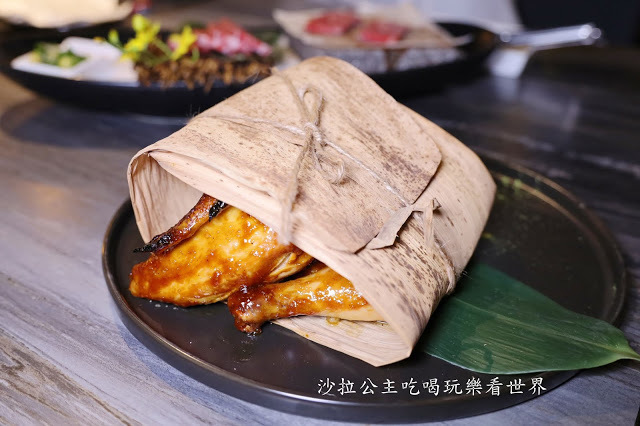 半隻雞利用烘烤的方式,上面塗滿了特製的炭火醬,烤熟後再利用"桂竹葉"包覆,利用雞肉的熱氣逼出竹葉的香氣,本來想說這樣會不會無法吸覆,想不到吃的時候雞皮上還真的帶有淡淡竹葉香,真是厲害