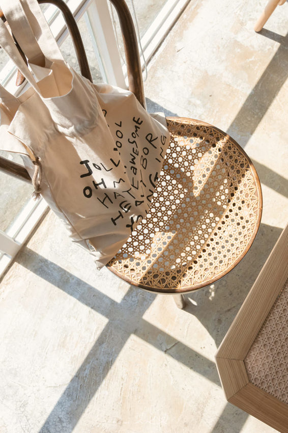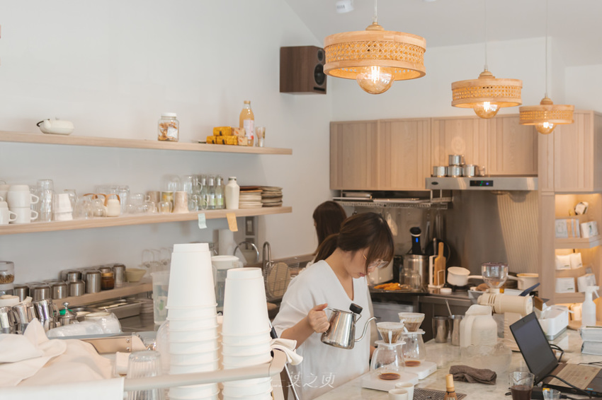 以草山綠為延伸,新的空間使用了大量的藤編元素,包括桌椅、熱水壺、杯墊、燈罩,這樣的淺藤色似乎替草山綠做了很好的視覺延展,統整了整體且一致性強烈。