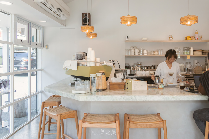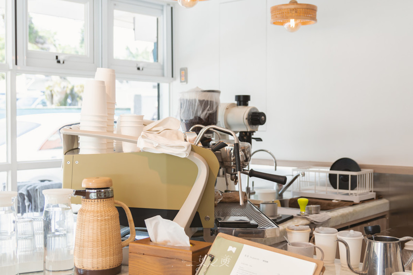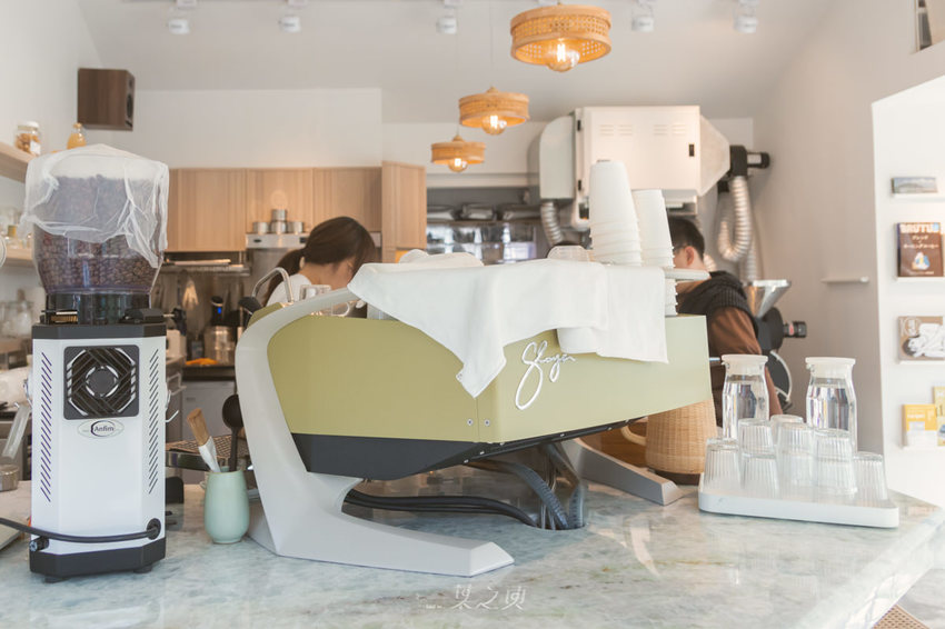 新的義式濃縮機選擇了Slayer,並且在面板部分也烤上了草山綠,放置在有著天然玉石綠紋的大理石吧檯桌上,讓整個吧檯區域成為了最大的視覺亮點。