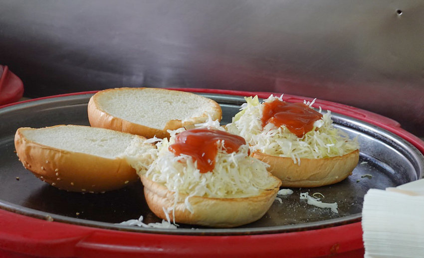 蓬萊漢堡現點現做,麵包會先用平底鍋煎,豬肉和雞肉也分別是現煎與現炸,製作過程中可以近距離看見阿姨用料不熟軟,而且食材和醬料都很台式,以炒過的洋蔥和高麗菜絲取代美式漢堡的生菜,醬料也不是放美乃滋,而是選用特製的番茄醬,徹頭徹尾的台灣味漢堡!
