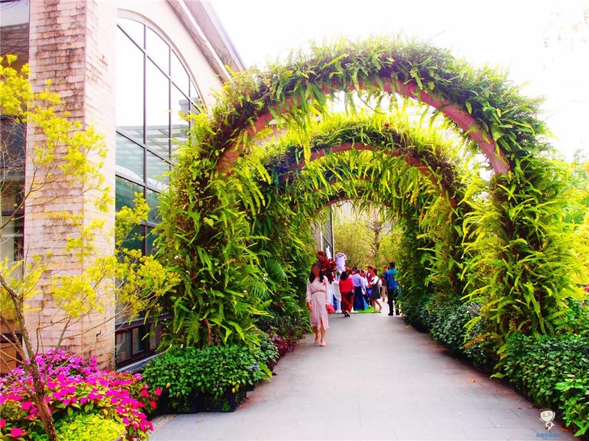 通過這個裝飾滿了各色植栽的拱門,就可抵達婚宴會館了