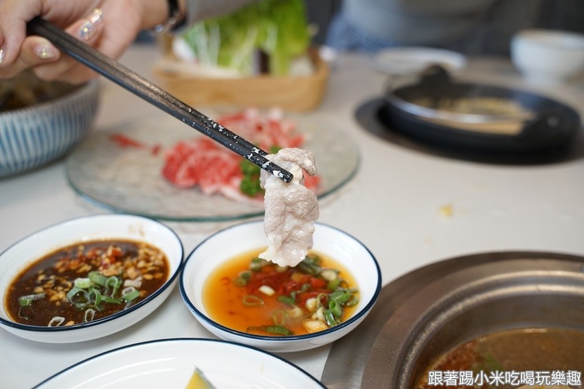 炒過半熟的肉,仍帶著油脂的肉香味,稍微涮一下來吃,是嫩中帶嚼勁的又香又甜,這就是石頭火鍋的魅力所在