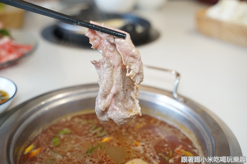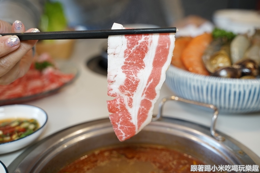雪花牛的油花非常的漂亮均勻,建議涮個2到3秒,軟嫩帶點嚼勁,當然麻辣鍋的好麻吉組合,配上牛奶鍋也挺不錯的!