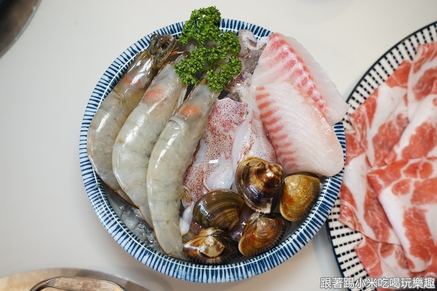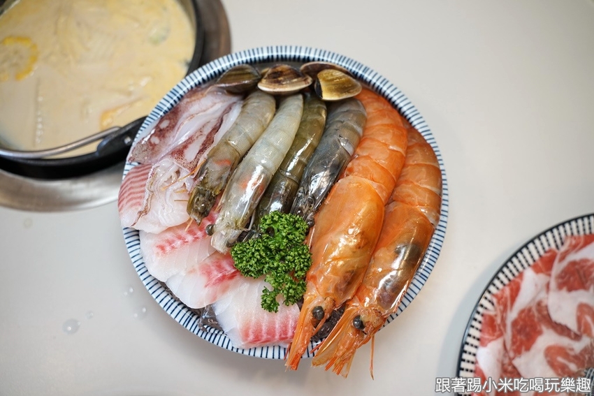 喜歡吃海鮮的朋友,就算湊不到兩個人吃2人同樂鍋,也是可以海鮮吃很爽,只要點套餐加點小海鮮(148元),有鮮白蝦、透抽、鯛魚及蛤蜊,自己就可以享受到海陸大餐,肉肉加上海鮮份量十足!