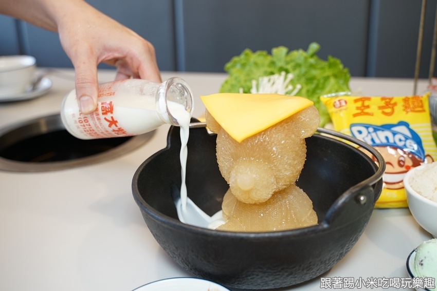 湯頭部份,則是除了蔬果豚骨及招牌石頭鍋是不用加錢;網美最愛的熊熊牛奶需要加價99元,看到超可愛的熊熊頭上頂一片起司泡著牛奶浴,少女心都噴發了!