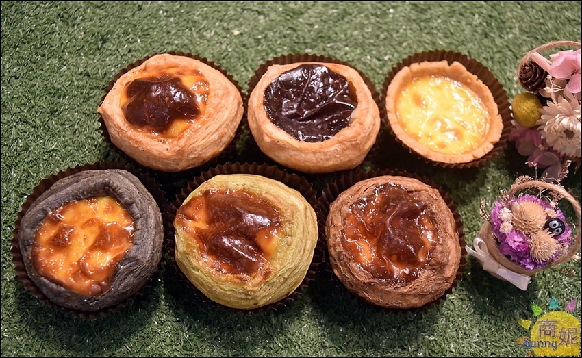 目前一共有六種口味:經典焦糖、古法黑糖、竹炭芋頭、日式牛奶、抹茶紅豆、瑞士巧克力。通通是蛋奶素,除了日式牛奶是餅乾塔皮之外,其餘都是256層酥皮。蛋定蛋塔一個 60元、一口酥乳酪酥兩個60元。可混搭都有買5送1優惠。
