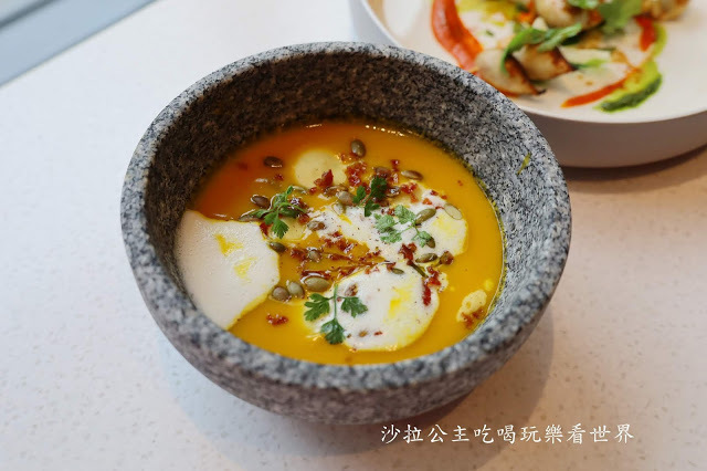 主廚選用台灣在地小農種植,甜度香氣最佳的南瓜品種為亮點,濃湯中加入主廚特製,集結奶油乳酪、馬斯卡邦和瑞可達三款起司與巴西里、山蘿蔔葉及蒔蘿、蝦夷蔥四種香料調味的義大利手工麵餃,搭配烤香的南瓜籽、培根碎與小豆蔻提味