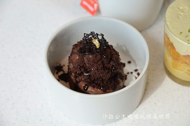 使用哈納瓜巧克力70%.巧克力雪酪.曲奇脆片,吃進口中不只是入口即化的巧克力冰淇淋,還帶有餅乾的脆口,冰淇淋舀下時還蠻扎實的,點上金箔更增加了質感