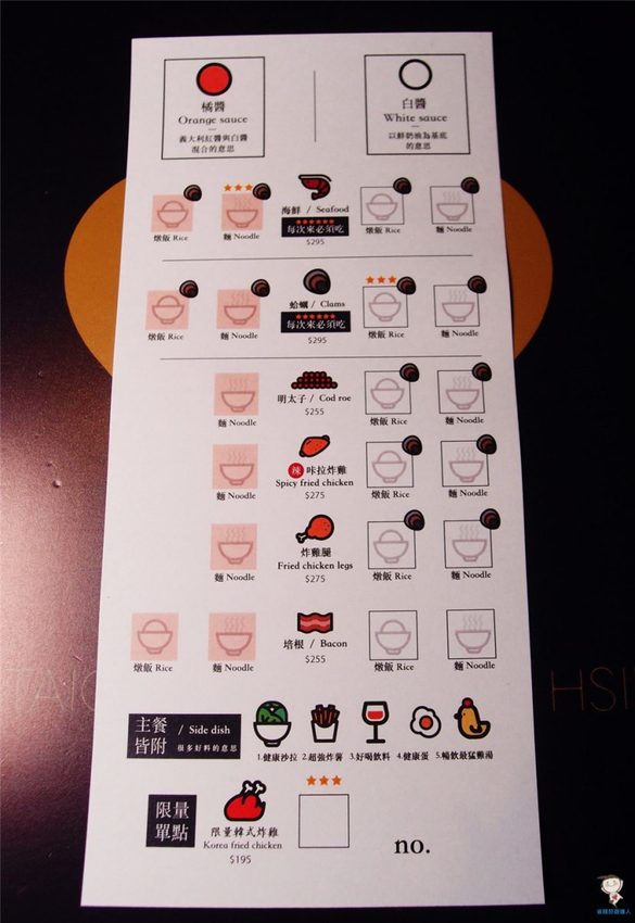 這張是義大利麵的菜單,先選橘醬還是白醬的醬汁,再來選燉飯或義麵