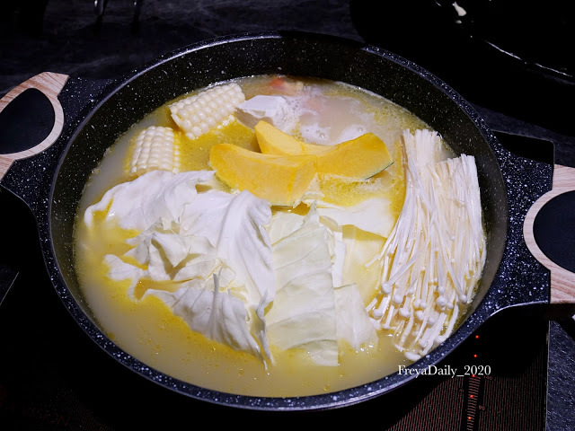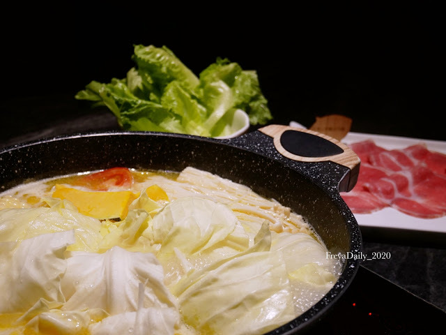 點完餐之後,鍋底一加熱就聞到湯頭的香氣,服務人員介紹湯底是玉米雞為基底的湯頭,很喜歡玉米雞,雞肉吃起來的味道不同,不過平常好像只有在吃台菜的時候會吃到。