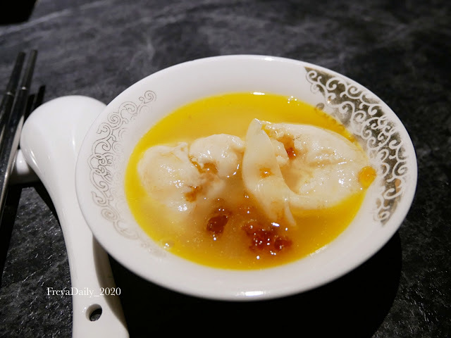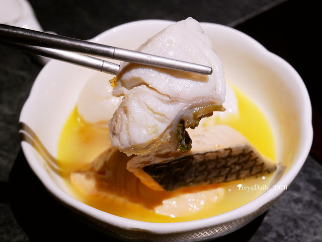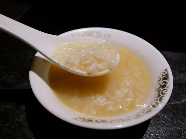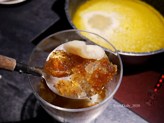 最後是甜點收尾,甜點是金耳桃膠,非常濃稠,添加桂圓煮出來的桃膠,果凍般的膠質味道很香,吃起來清甜爽口,不太像湯頭的膠質會黏嘴唇,覺得有這樣的差異還蠻有趣的,是個很舒服的用餐結尾。