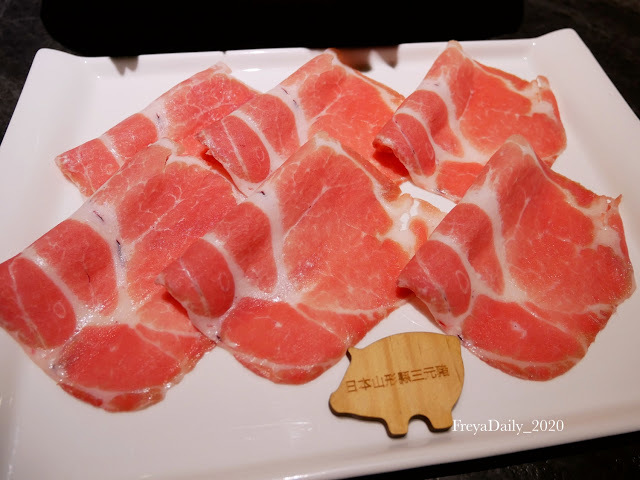 日本山形三元豬,豬肉吃起來完全沒有豬腥味,肉質很細嫩,油花分布均勻,吃起來不油膩,是爽口的豬肉。