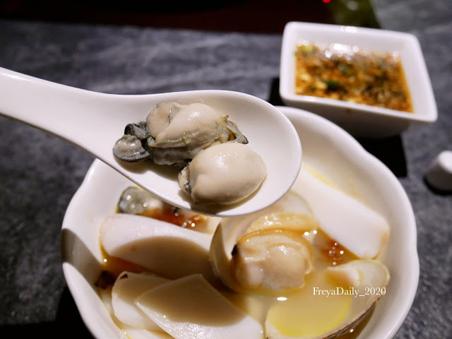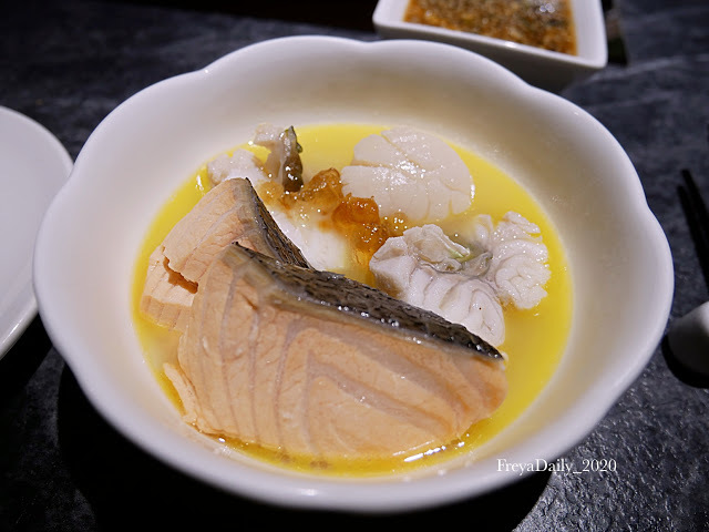 時令鮮魚盤的魚類,會依照當日大安9號有哪些時令魚提供,都是生食等級的魚食材,所以可以煮到八、久分熟即可,今天提供的魚是青衣和鮭魚,鮮魚盤上另外的海鮮有牛奶貝、干貝、軟絲和鮮蚵。