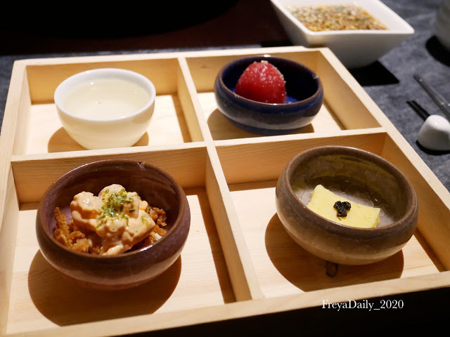 (右下)黑松露玉子燒,黑松露只有一點點,味道就很濃烈,綜合玉子燒的微甜味道,兩者很適合,一直以為松只適合歐美,所以吃起來很意外;(左下)生魚片魚酥,微嗆的生魚片沙拉,口味比較重,而且是相較其他前菜,味道非常重的一道料理,原味的魚酥,吃起來很香脆,有點像油條的口感。