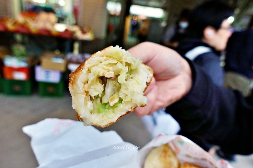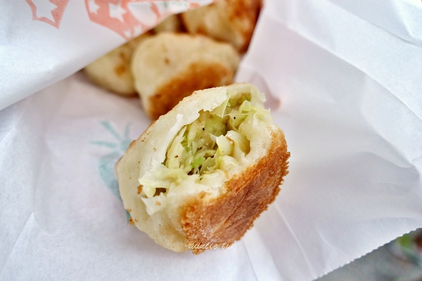 水煎包的內餡是高麗菜口味,味道清甜,而且還加了蝦米在裡頭,吃起來更香!