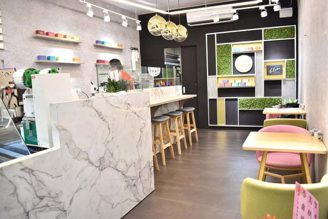 座落於永和美食林立的地理位置,從馬路上一路看下去,就屬「禮采芙-永安市場店」的室內設計最顯目了,粉嫩的綠色,帶著自然的小清新,不變的是綠野仙蹤的打卡牆與茶葉禮盒,文青風的手寫字,大理石牆面加上金屬吊燈點綴,自然清新兼具時尚理念。