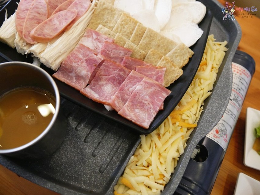部隊鍋反正放著隨時去弄他一下,很快就可以吃了。畢竟是部隊鍋,經典的泡麵是一定要有的,還有經典的起司片跟韓國年糕,另外也有韓國魚板、鳥蛋那些,一整鍋非常的豐富,有點像是一大鍋料很豐富的泡麵鍋,你小時候也有泡麵吃到爽的夢想嗎?感覺這裡可以完美實現啊!而且那紅紅的顏色,光看就覺得很有食慾。