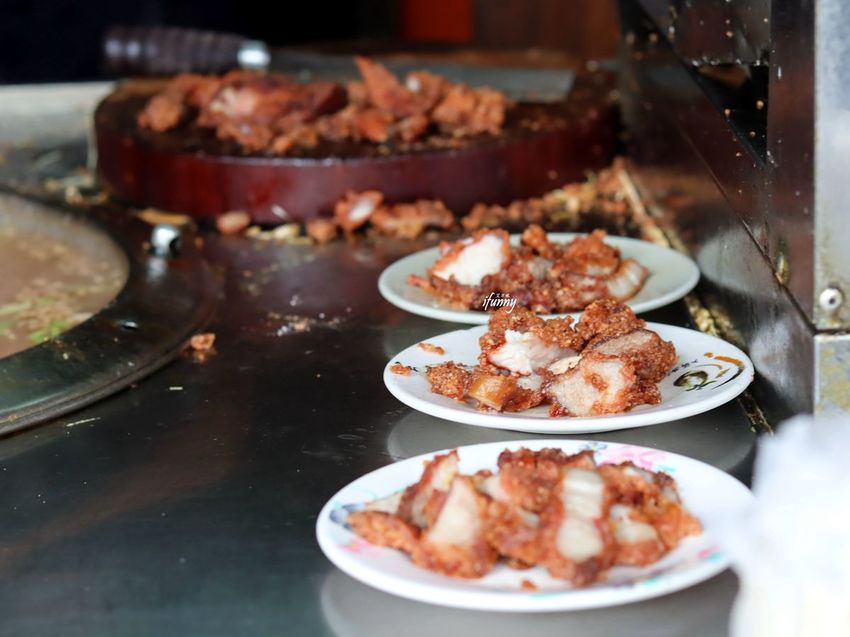 上桌前會淋上特製的甜辣醬及薑絲。雖然攤頭上的紅燒肉都剩下瘦肉,而且淋醬後多少影響到酥脆度,但這紅燒肉炸衣帶著甜脆,豬肉也很新鮮,雖然比不上心目第一名的阿角紅燒肉,但仍覺得是表現得很不錯!