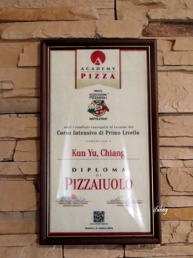 到了二樓,在牆上有許多老闆江哥與其長子,一起遠赴義大利的照片。他們到發源地去了解披薩的歷史,並深入其文化,再經過自己的對料理的熱忱,鑽研出獨一無二,而且無法被複製的披薩。