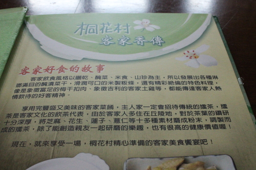 這個名為「桐花村」的客家美食餐館,其實也是薰衣草森林旗下的一家餐飲品牌,由於兩個創辦人之一,有一名就是客家人,加上家中經營客家相關的產品,卻缺乏行銷,覺得可惜,因而,在2006年產生了,將品牌延伸至客家文化的念頭。