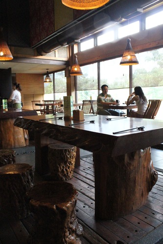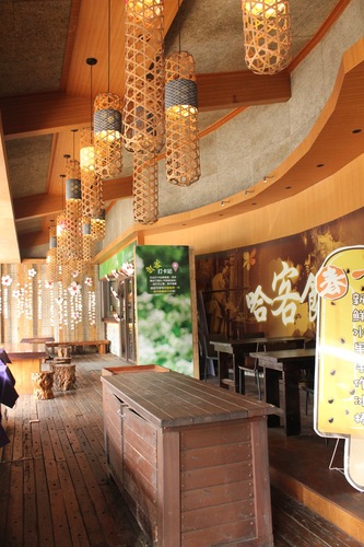 這幾年,客家文化與桐花之間,有非常強烈的聯結,也因此,這家由薰衣草森林成立的餐飲部,也以桐花為意像,作為包裝。走進室內,可以看到古樸的桌椅陳設,再加上以花布色彩包裝的燈飾,桐花圖示,濃濃的客家風,就這樣再踏入店內時,展露無遺。