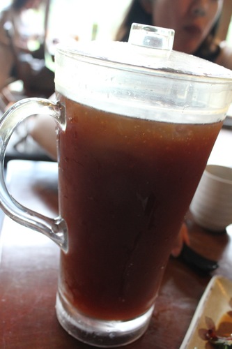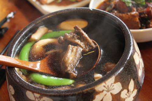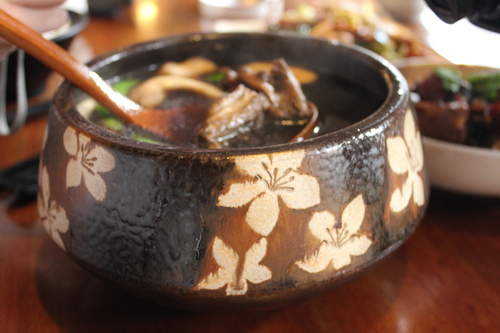 對我來說,比較特別的是這道湯,客家仙草雞湯,以前,我不知道仙草與客家也有關,聽店員介紹才知道,原來客家村的人們都會制作仙草乾,曬過的仙草乾可以做很多料理,而這個製成的湯,也很不錯。我很喜歡它成湯的容器,這些器皿,不只是很厚實,造型也增添幾分美味。