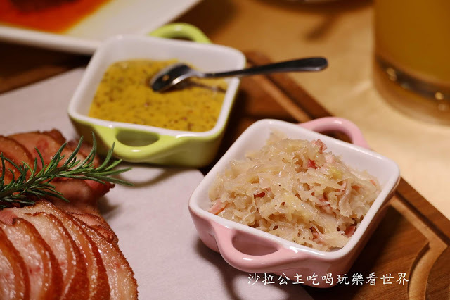 配菜有黃芥末和酸菜,酸菜裡面有家切碎培根,吃起來不死鹹,搭配德國豬腳吃,滋味更加豐富有層次